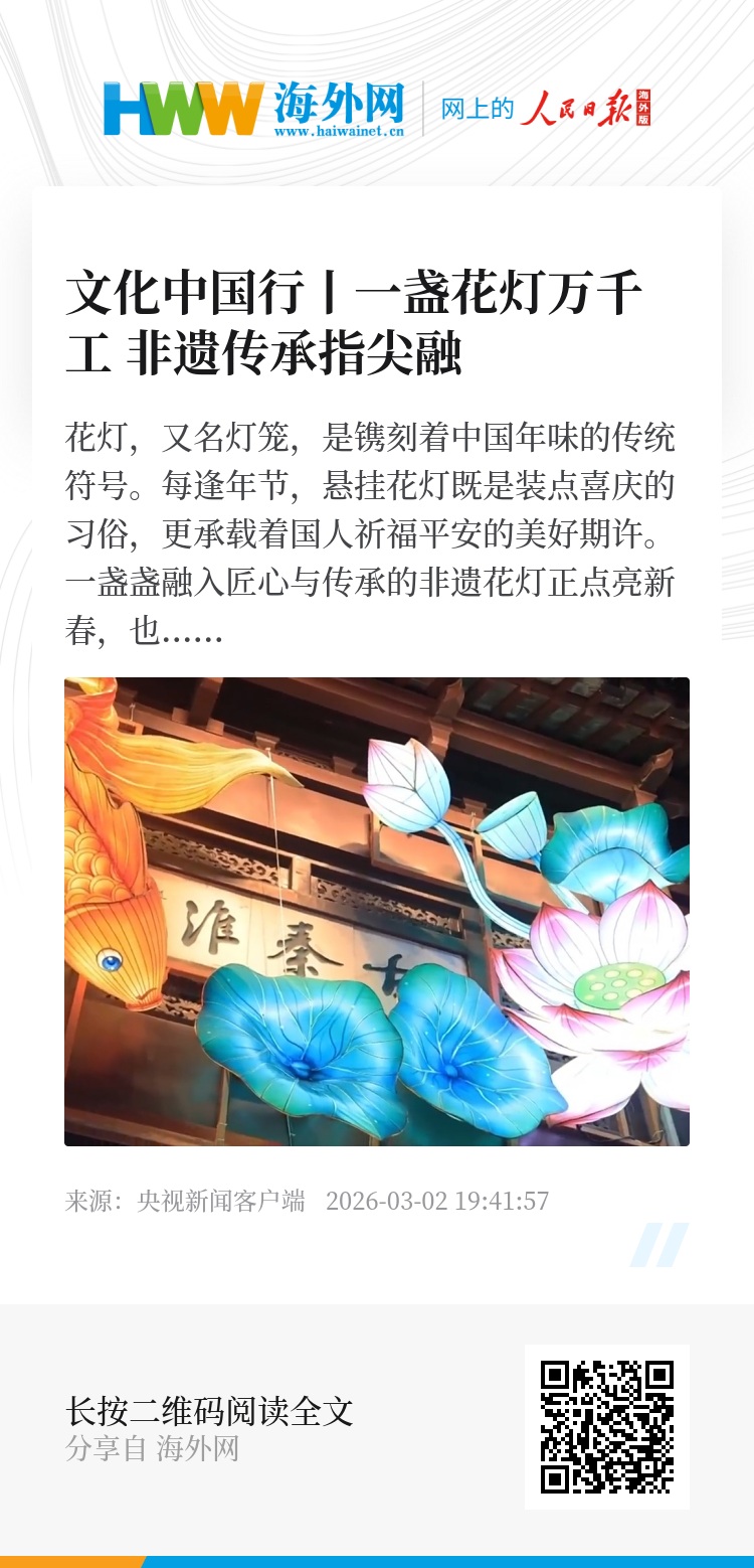 花灯,又名灯笼,是镌刻着中国年味的传统符号。每逢年节,悬挂花灯既是装点喜庆的习俗,更承载着国人祈福平安的美好期许。一盏盏融入匠心与传承的非遗花灯正点亮新春,也点亮人们的幸福生活。