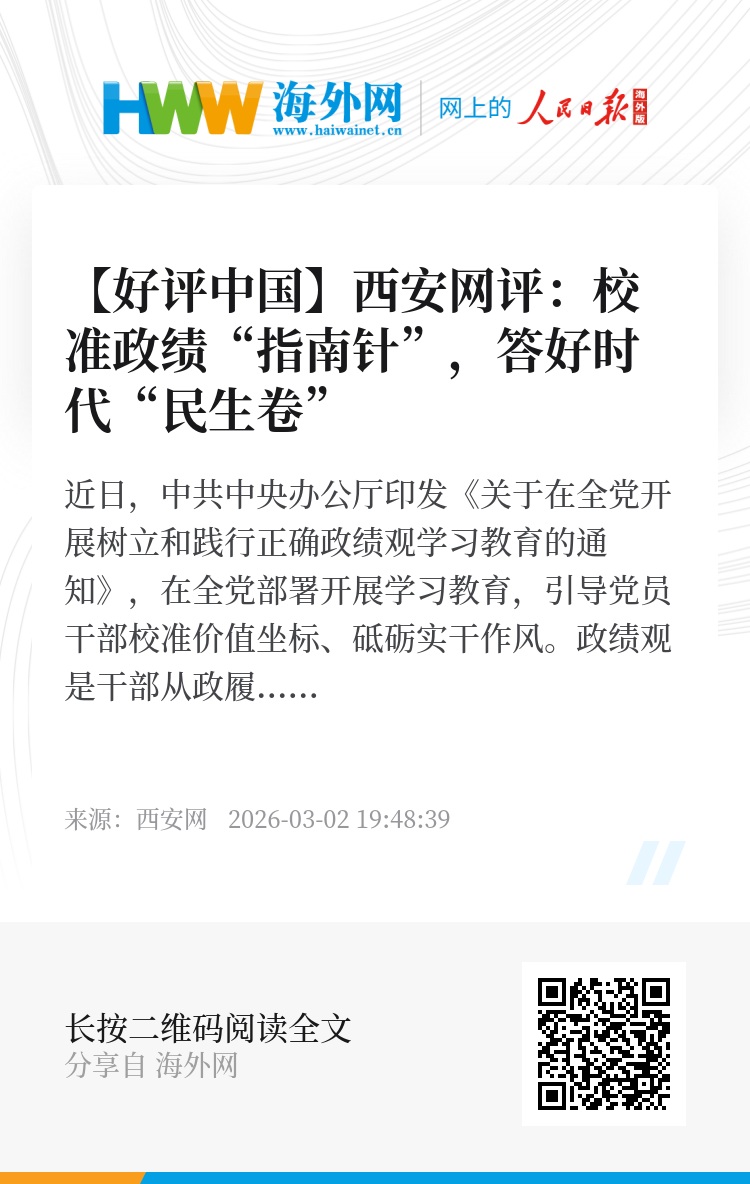 近日,中共中央办公厅印发《关于在全党开展树立和践行正确政绩观学习教育的通知》,在全党部署开展学习教育,引导党员干部校准价值坐标、砥砺实干作风。政绩观是干部从政履职的“总开关”,关乎发展方向、民心向背与事业长远。奋进“十五五”新征程,唯有树立和践行正确政绩观,坚守为民初心、恪守务实底色、追求长效实绩,才能创造出经得起实践、人民和历史检验的过硬政绩,为中国式现代化建设注入更加持久的动力。