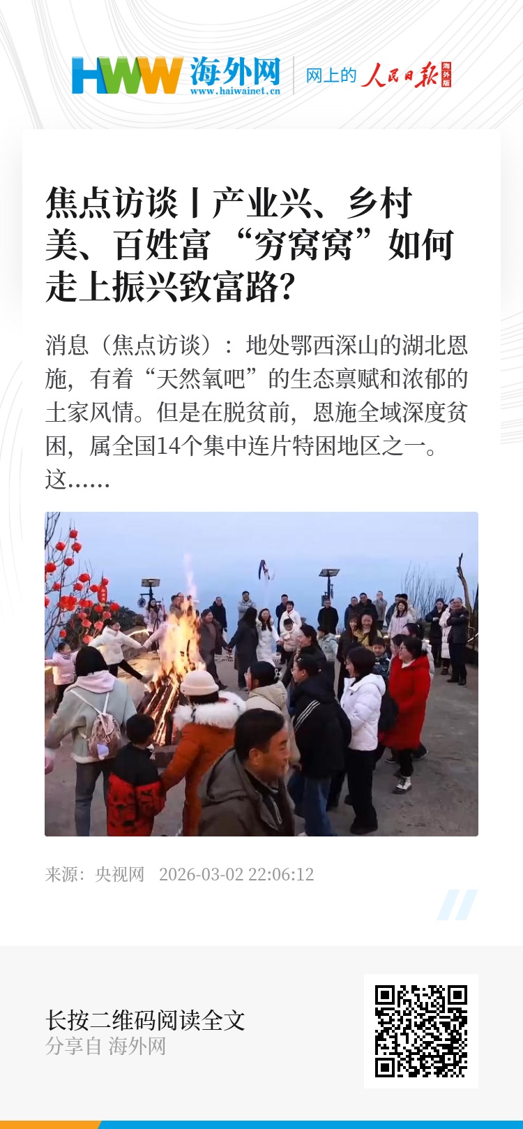 央视网消息(焦点访谈):地处鄂西深山的湖北恩施,有着“天然氧吧”的生态禀赋和浓郁的土家风情。但是在脱贫前,恩施全域深度贫困,属全国14个集中连片特困地区之一。这里的巴东县土店子村也曾是美景中藏着的“穷窝窝”——平均海拔1200米的深山里,道路崎岖、产业空白,贫困率超过48%。脱贫攻坚的路上,在政策帮扶和全村人实干下,村里路网通了,靠着“一猪一梨”特色种养,2020年底实现了脱贫。如今乡村振兴正当时,村里念起“农旅经”,500亩梨园变景区、土家民居改民宿。就像其他脱贫村一样,这背后离不开基层党组织凝心聚力的坚实支撑。