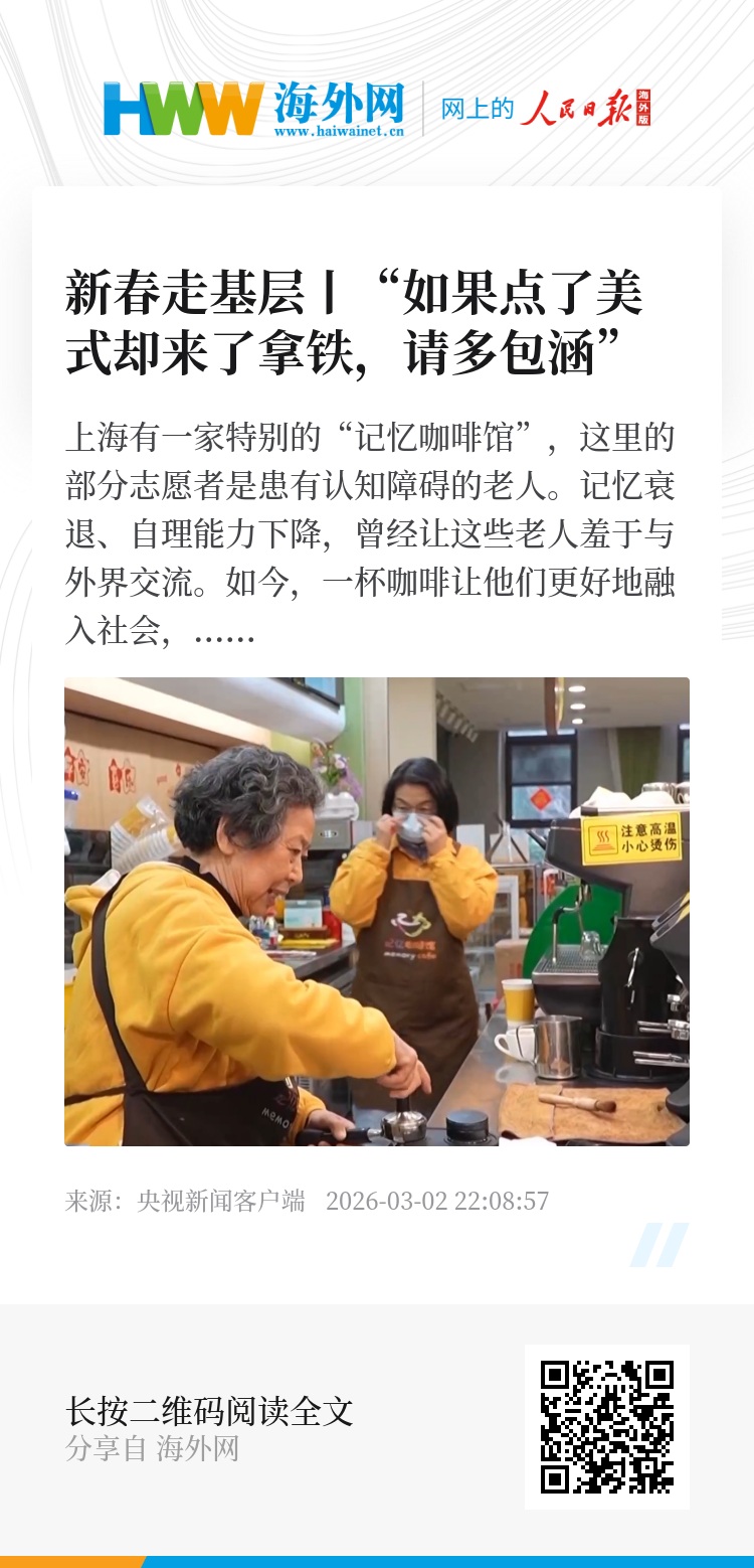 总台央视记者 闫素:“遇见记忆咖啡”这六个缺少笔画的大字是专门设计的“阿尔茨海默字体”,它真实呈现出认知症长辈眼中的世界。小小的咖啡馆让老人们从被动照护转向主动融入生活,也为城市养老写下温暖而充满希望的新篇章。