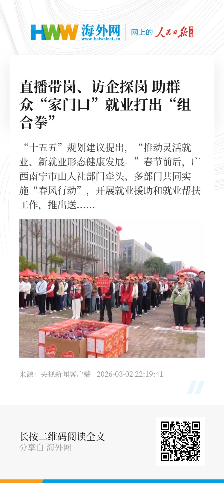除了送岗上门和探岗访企,春节期间广西南宁市还在线上线下开展200多场招聘会,特别是重点推出大量本地就业岗位,帮助务工人员实现“家门口就业”。