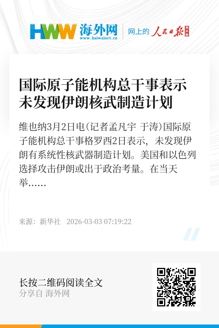 新华社维也纳3月2日电(记者孟凡宇 于涛)国际原子能机构总干事格罗西2日表示,未发现伊朗有系统性核武器制造计划。美国和以色列选择攻击伊朗或出于政治考量。