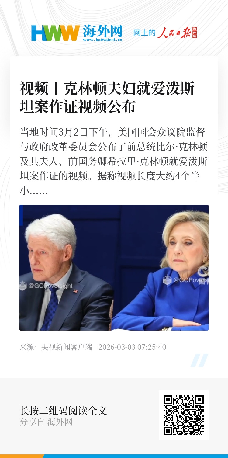当地时间3月2日下午,美国国会众议院监督与政府改革委员会公布了前总统比尔·克林顿及其夫人、前国务卿希拉里·克林顿就爱泼斯坦案作证的视频。据称视频长度大约4个半小时。