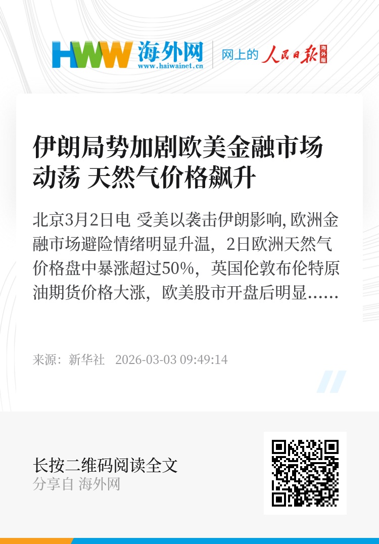 新华社北京3月2日电 受美以袭击伊朗影响,欧洲金融市场避险情绪明显升温,2日欧洲天然气价格盘中暴涨超过50%,英国伦敦布伦特原油期货价格大涨,欧美股市开盘后明显下跌。