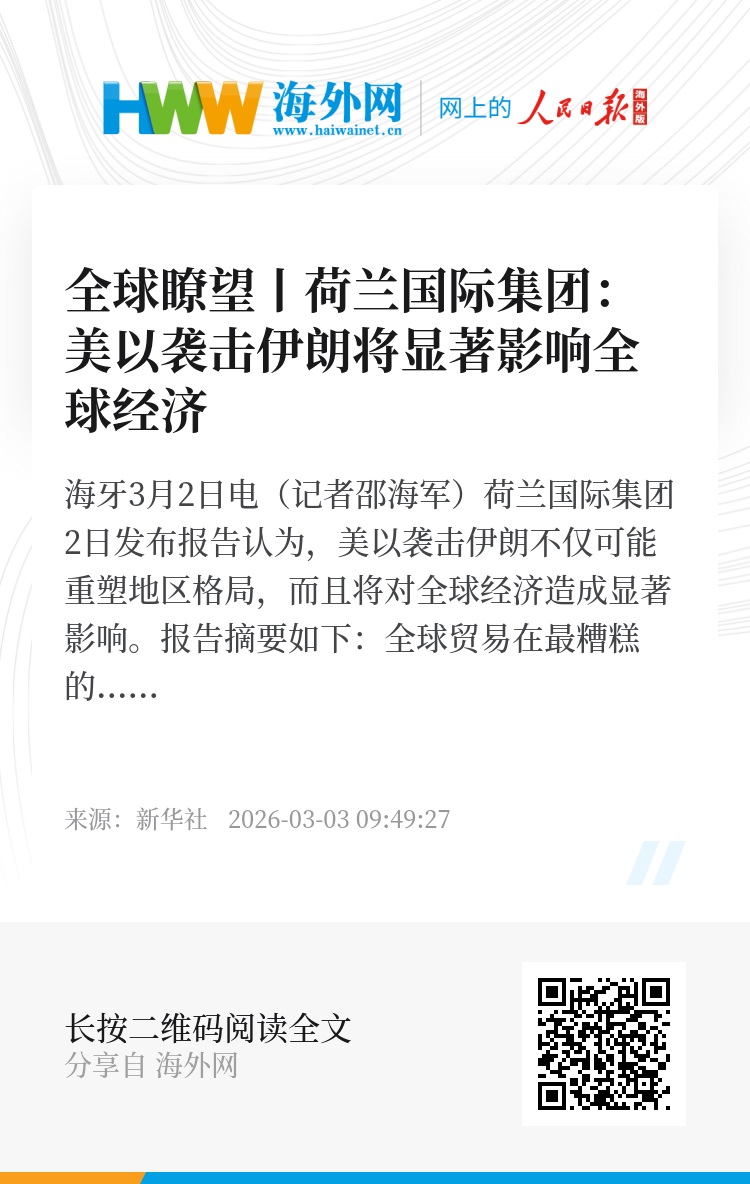 新华社海牙3月2日电(记者邵海军)荷兰国际集团2日发布报告认为,美以袭击伊朗不仅可能重塑地区格局,而且将对全球经济造成显著影响。报告摘要如下: