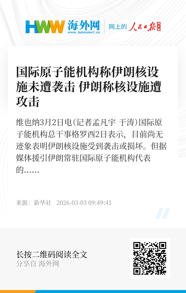 新华社维也纳3月2日电(记者孟凡宇 于涛)国际原子能机构总干事格罗西2日表示,目前尚无迹象表明伊朗核设施受到袭击或损坏。但据媒体援引伊朗常驻国际原子能机构代表的话说,伊朗核设施已遭到攻击。