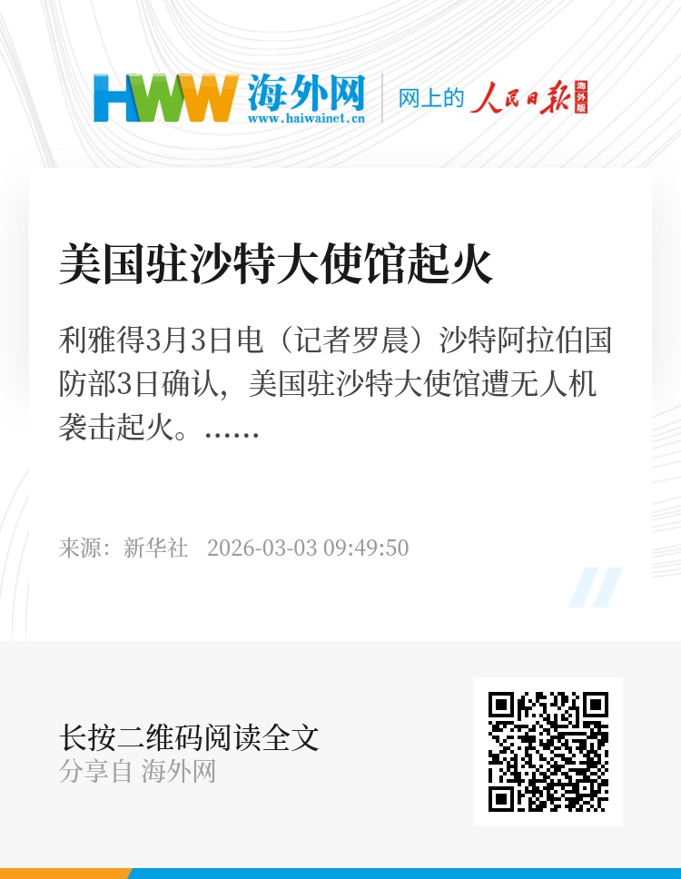 新华社利雅得3月3日电(记者罗晨)沙特阿拉伯国防部3日确认,美国驻沙特大使馆遭无人机袭击起火。
