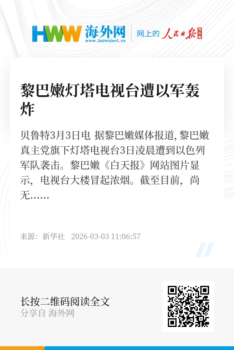 新华社贝鲁特3月3日电 据黎巴嫩媒体报道,黎巴嫩真主党旗下灯塔电视台3日凌晨遭到以色列军队袭击。