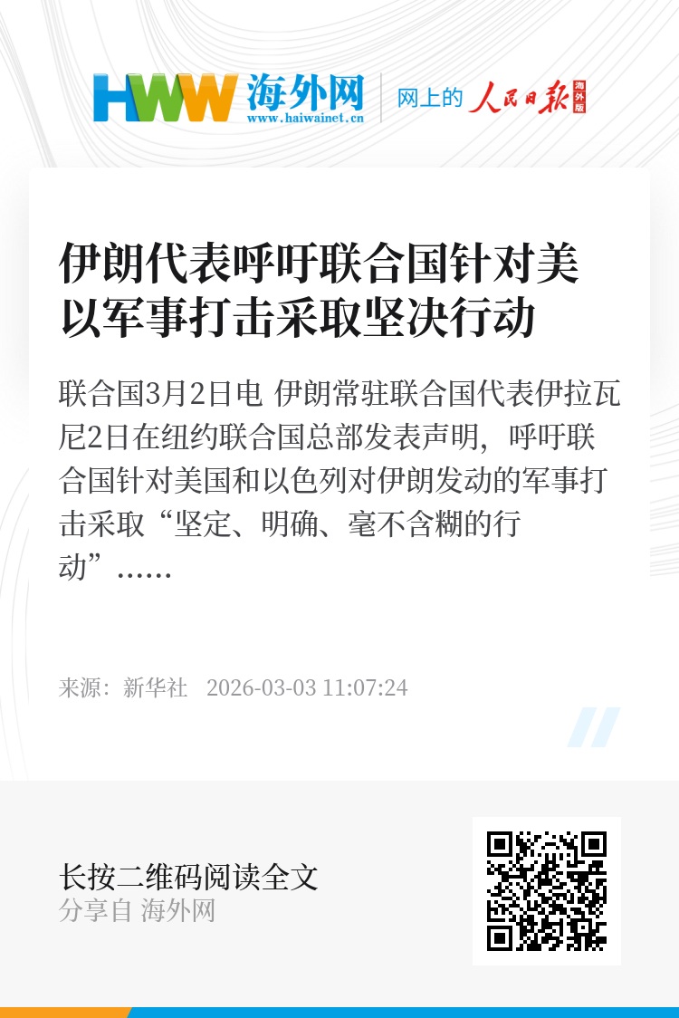 新华社联合国3月2日电 伊朗常驻联合国代表伊拉瓦尼2日在纽约联合国总部发表声明,呼吁联合国针对美国和以色列对伊朗发动的军事打击采取“坚定、明确、毫不含糊的行动”。