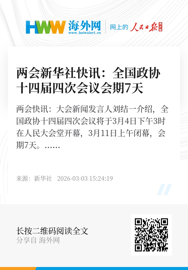 两会新华社快讯:大会新闻发言人刘结一介绍,全国政协十四届四次会议将于3月4日下午3时在人民大会堂开幕,3月11日上午闭幕,会期7天。