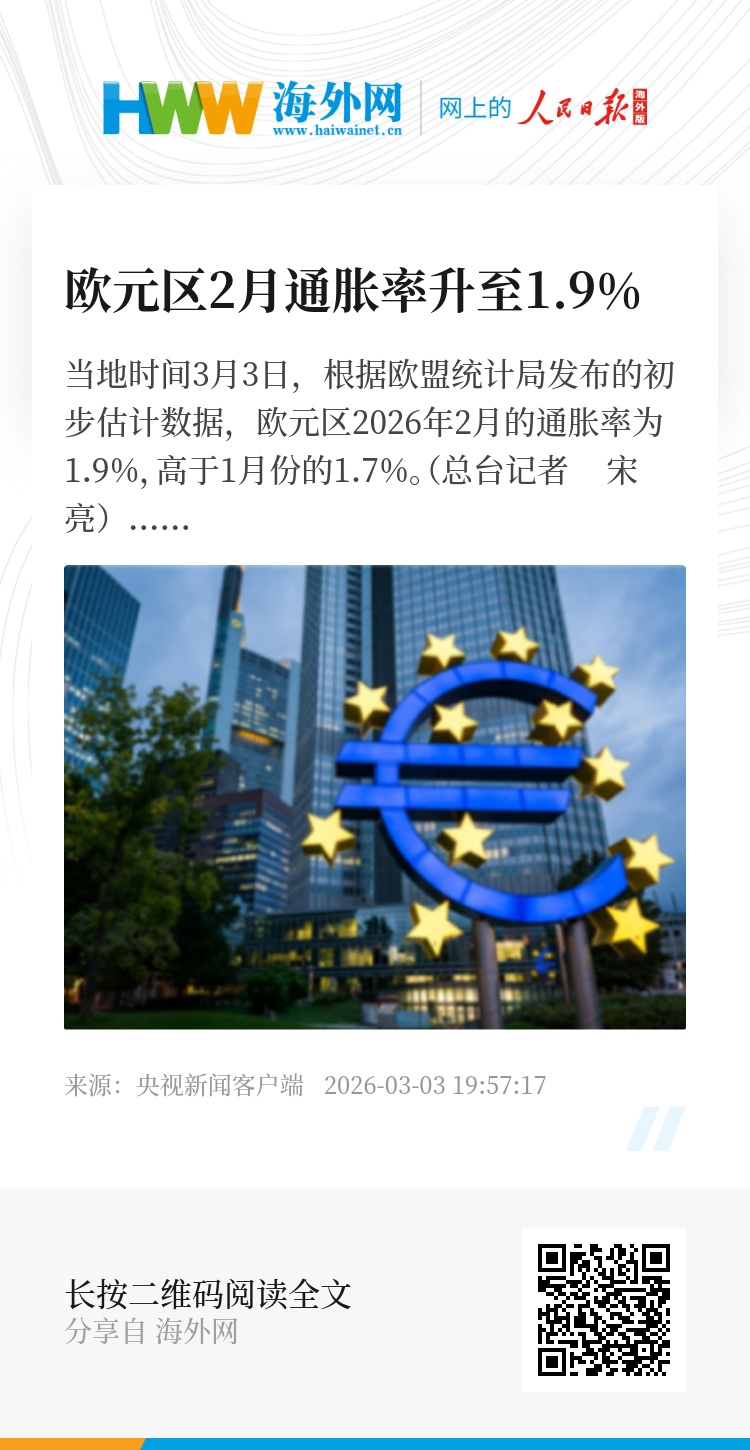 当地时间3月3日,根据欧盟统计局发布的初步估计数据,欧元区2026年2月的通胀率为1.9%,高于1月份的1.7%。(总台记者 宋亮)