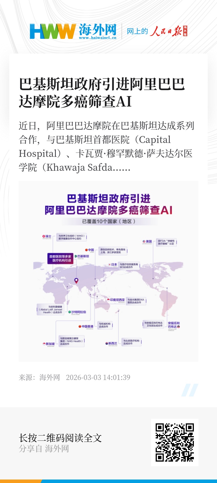 巴基斯坦信息技术和通信部部长莎萨·法蒂玛·赫瓦贾曾在中国访问时了解到达摩院多癌筛查AI,随后积极推动引入。她表示:“巴基斯坦正在构建一个包容的人工智能创新生态,医疗健康更是巴基斯坦首个国家人工智能政策(National AI Policy)的优先关注领域。这项中国技术非常契合巴基斯坦的需求,我们欢迎像阿里巴巴这样的领先企业带来前沿AI,惠及更多民众。”