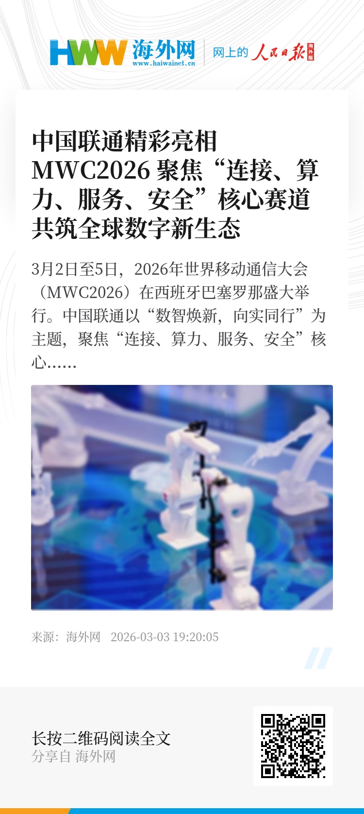 3月2日至5日,2026年世界移动通信大会(MWC2026)在西班牙巴塞罗那盛大举行。中国联通以“数智焕新,向实同行”为主题,聚焦“连接、算力、服务、安全”核心赛道,携“算网为基、数实融合、创享新生”三大板块、18个展项惊艳亮相,全景呈现AI与数智技术驱动全球产业创新的中国方案。