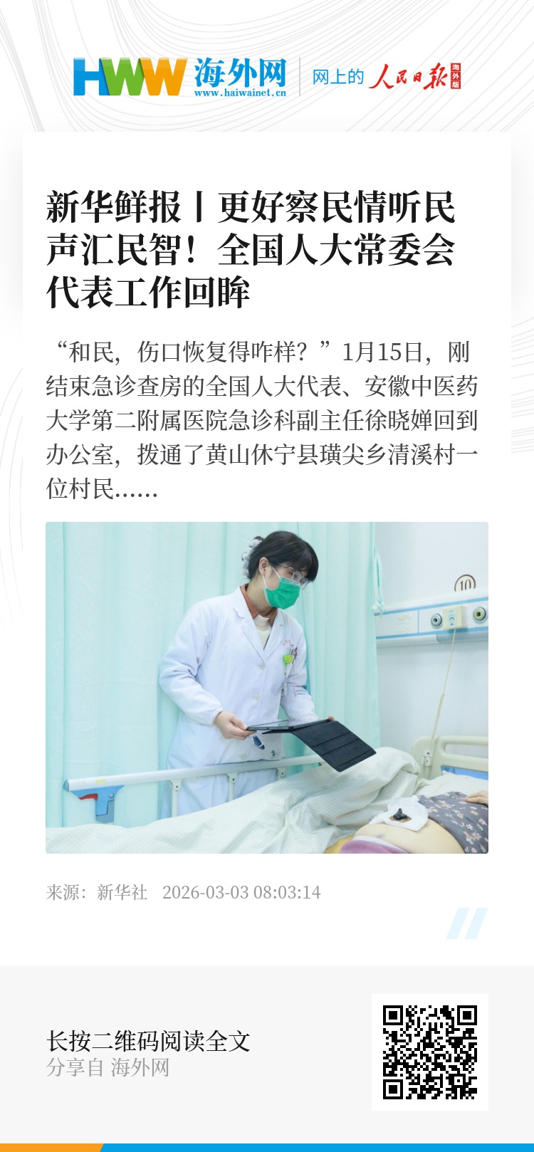 “和民,伤口恢复得咋样?”1月15日,刚结束急诊查房的全国人大代表、安徽中医药大学第二附属医院急诊科副主任徐晓婵回到办公室,拨通了黄山休宁县璜尖乡清溪村一位村民的电话。