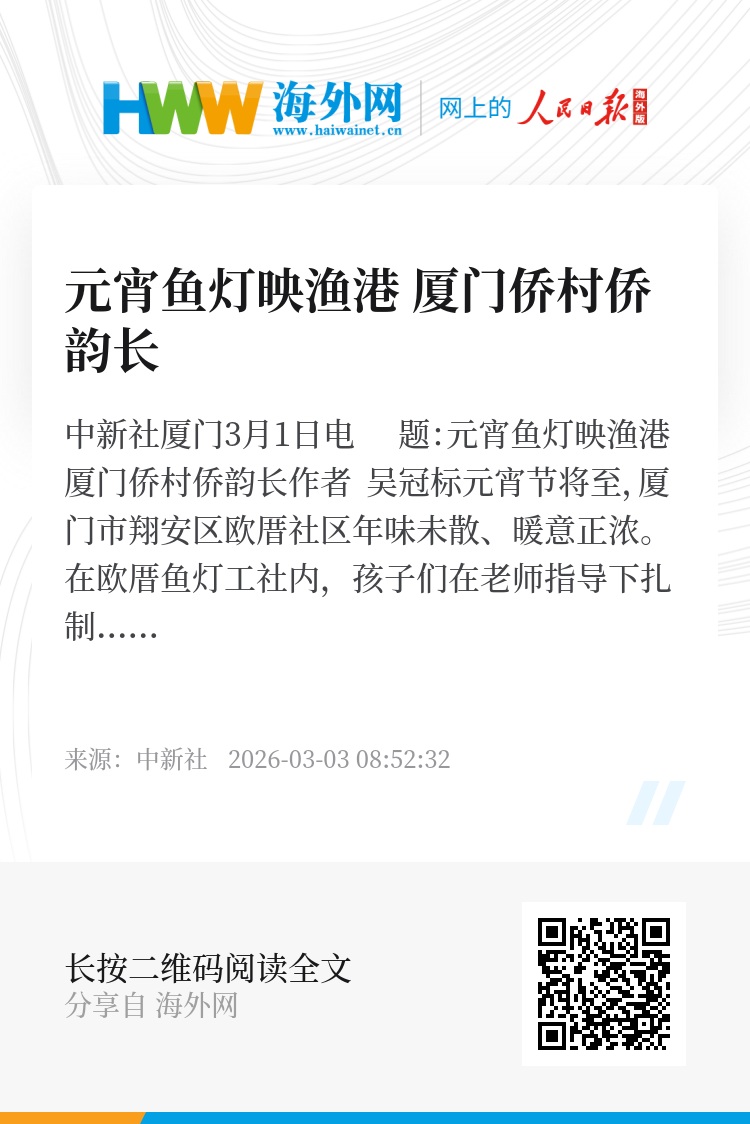元宵节将至,厦门市翔安区欧厝社区年味未散、暖意正浓。在欧厝鱼灯工社内,孩子们在老师指导下扎制传统鱼灯,剖竹为骨、糊纸描彩,灯面上写下的新春祝福格外醒目。元宵节当晚,百盏鱼灯将点亮渔港,上演一场独具渔村特色的游灯盛会。