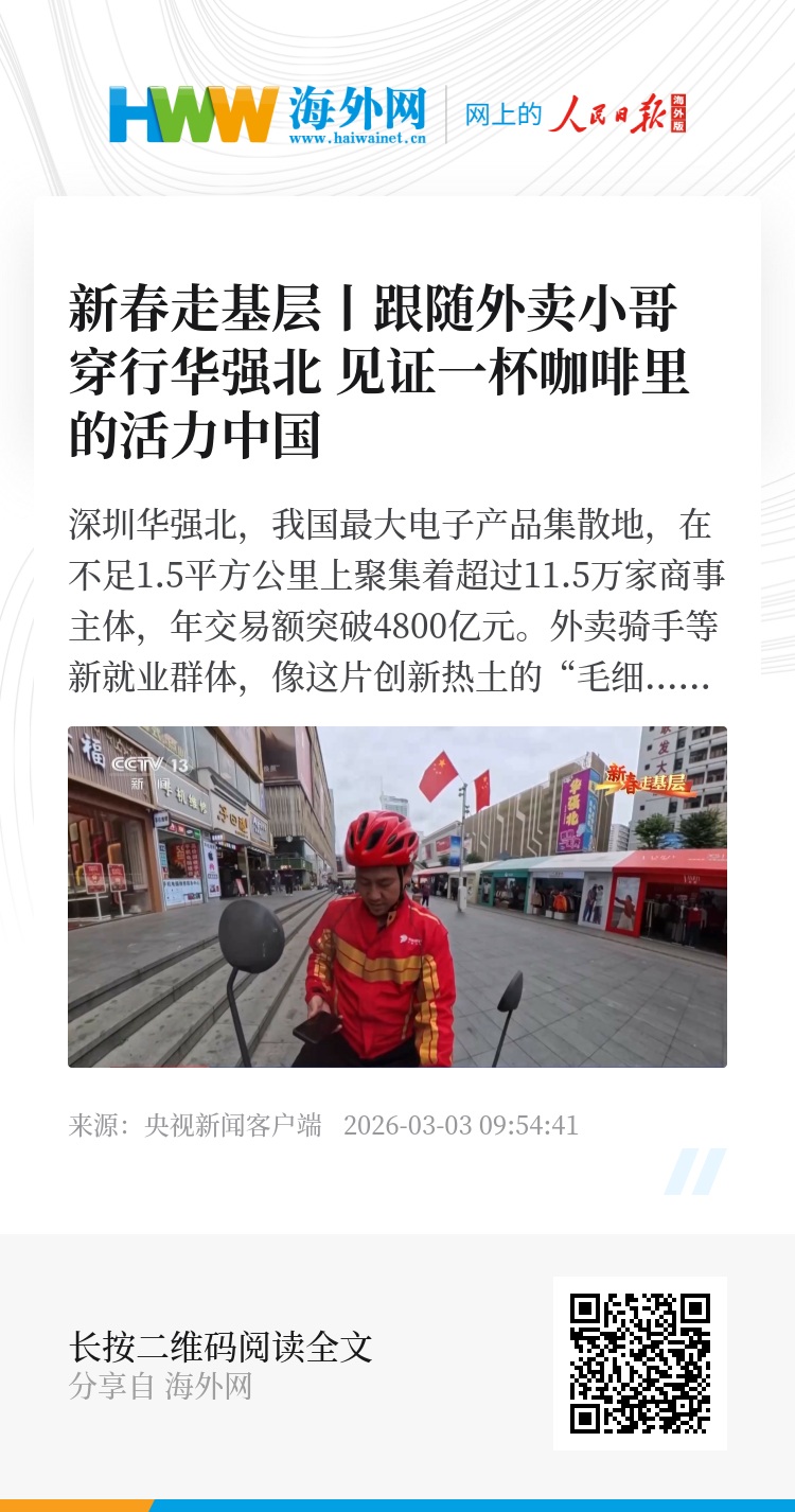 深圳华强北,我国最大电子产品集散地,在不足1.5平方公里上聚集着超过11.5万家商事主体,年交易额突破4800亿元。外卖骑手等新就业群体,像这片创新热土的“毛细血管”,保障着城市的高效运转。跟随外卖小哥一起感受“中国电子第一街”的变化,见证一杯咖啡里的活力中国。