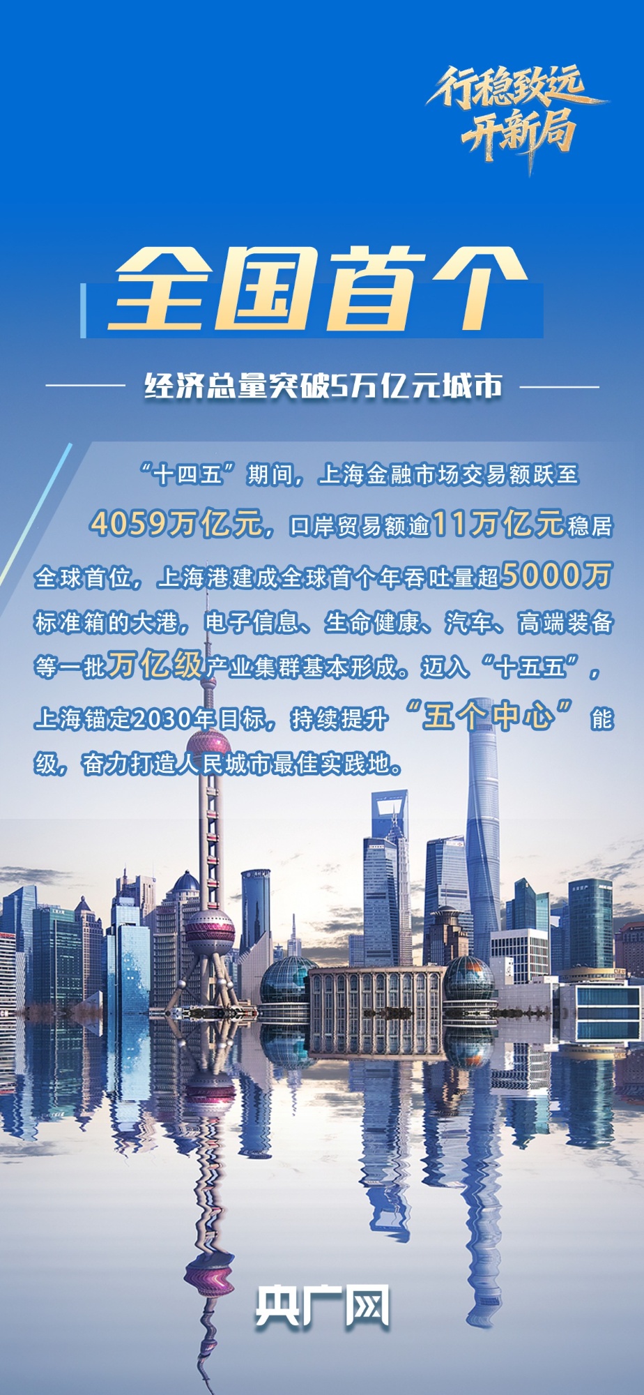 “十四五”期间,上海聚焦建设国际经济中心、金融中心、贸易中心、航运中心、科技创新中心的重要使命,综合实力实现新跨越。全市生产总值从4.16万亿元增加到5.67万亿元,成为全国首个经济总量突破5万亿元的城市,跻身全球城市前五位。成绩单背后,既是上海“五个中心”建设的阶段性成效,更是“十五五”期间迈向更高能级的底气所在。