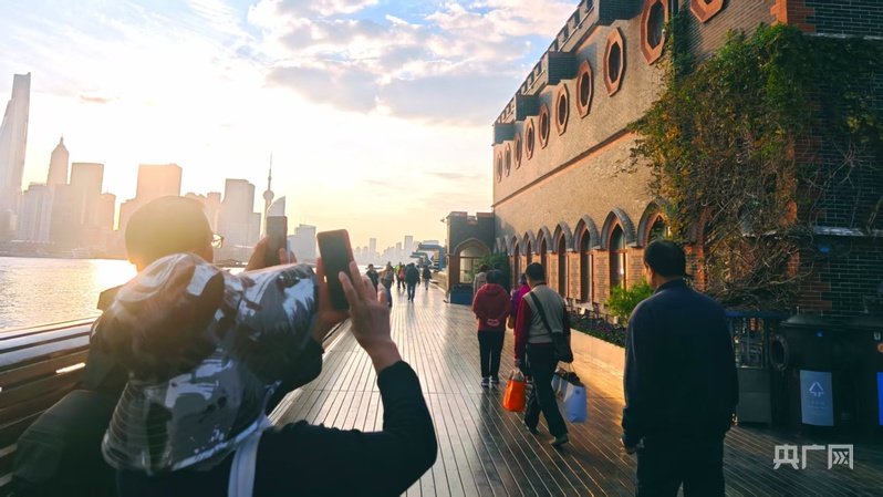 市民游客漫步杨浦滨江岸线,不时驻足“打卡”(央广网记者 冯丽 摄)