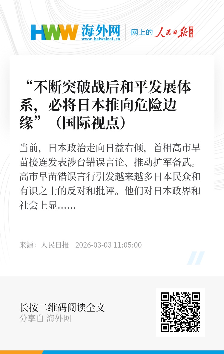 “高市政府当前有关防卫政策的一系列举动,无法为日本带来真正安全,反而不断推高地区紧张局势。”日本律师杉浦瞳对记者表示,日本宪法第九条是日本战后和平体制的核心,也是周边国家对日本保持信任的重要基础。坚守宪法第九条,不仅关乎国际信誉,更直接关系日本自身安全。“日本实现安全与发展的前提是深刻反省侵略历史、坚守反战原则。日本应积极推动构建地区和平环境,并珍视同中国长期形成的稳定关系。”