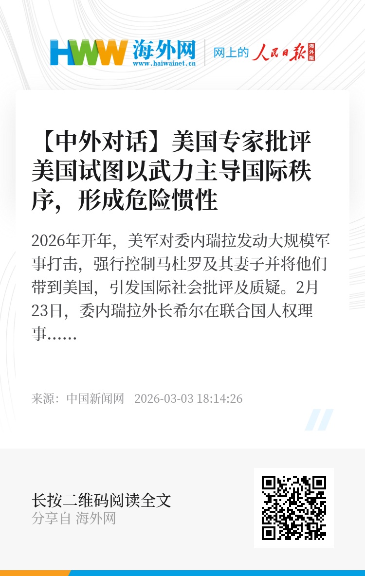 2026年开年,美军对委内瑞拉发动大规模军事打击,强行控制马杜罗及其妻子并将他们带到美国,引发国际社会批评及质疑。2月23日,委内瑞拉外长希尔在联合国人权理事会第61届会议发言时要求美国立即释放委内瑞拉总统马杜罗及其妻子。在做客新一期“中外对话”时,美中合作基金会执行主席约翰·米勒-怀特(John Milligan-Whyte)指出,特朗普政府通过军事行动展示权力、制造紧急状态的做法,正在形成危险的政治惯性。在他看来,特朗普政府试图通过军事施压和政策操作主导国际秩序,并掌控国内舆论。这种策略如同一剂危险的兴奋剂,会带来深层风险。(记者 陈天浩)