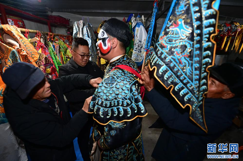 3月2日凌晨,陇县黄花峪村村民为社火队队员穿戴演出服饰。新华社记者 邹竞一 摄