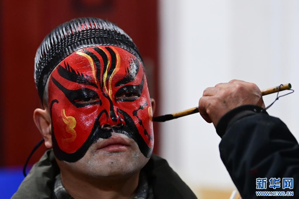 3月2日凌晨,老艺人为陇县黄花峪村社火队队员绘制社火脸谱。新华社记者 邹竞一 摄