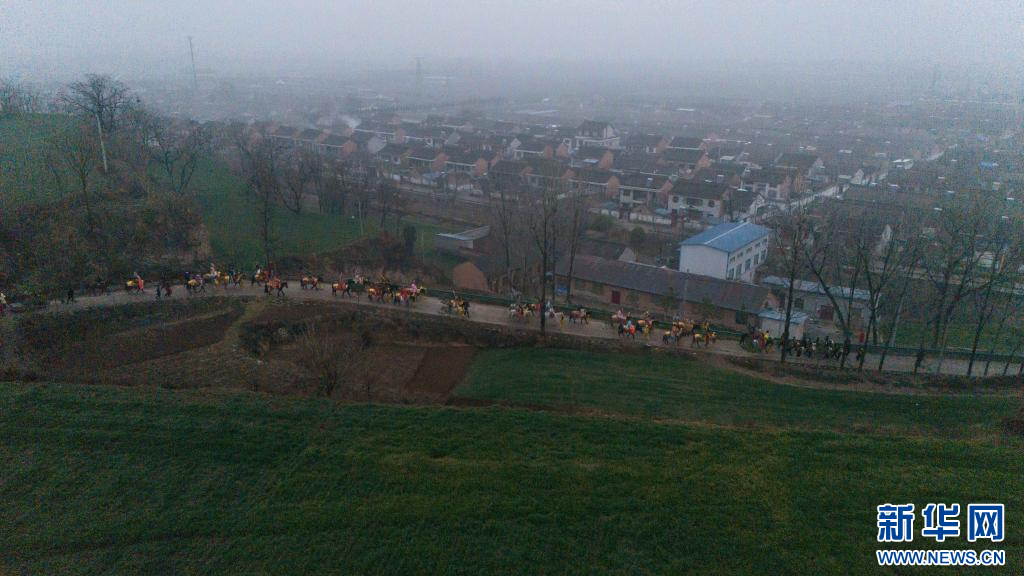 3月2日,陇县黄花峪村社火队在游演途中(无人机照片)。新华社记者 邹竞一 摄