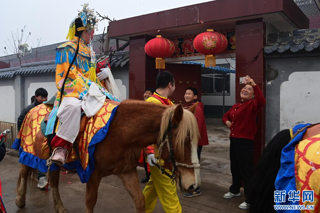 3月2日,陇县黄花峪村村民在家门口迎接社火队。新华社记者 邹竞一 摄