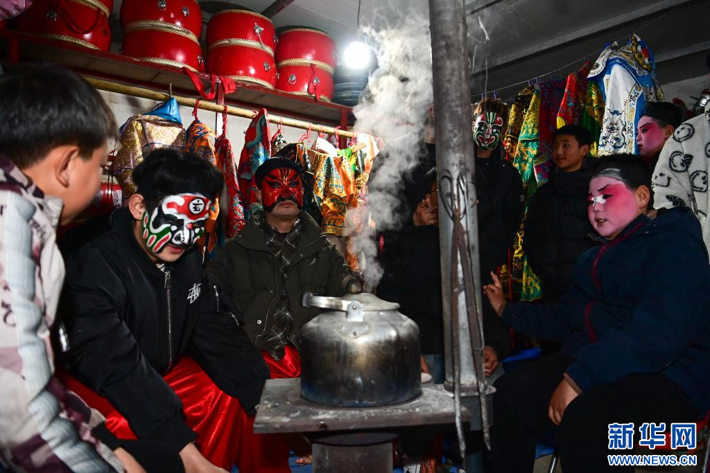 3月2日,陇县黄花峪村社火队队员在相互交流。新华社记者 邹竞一 摄