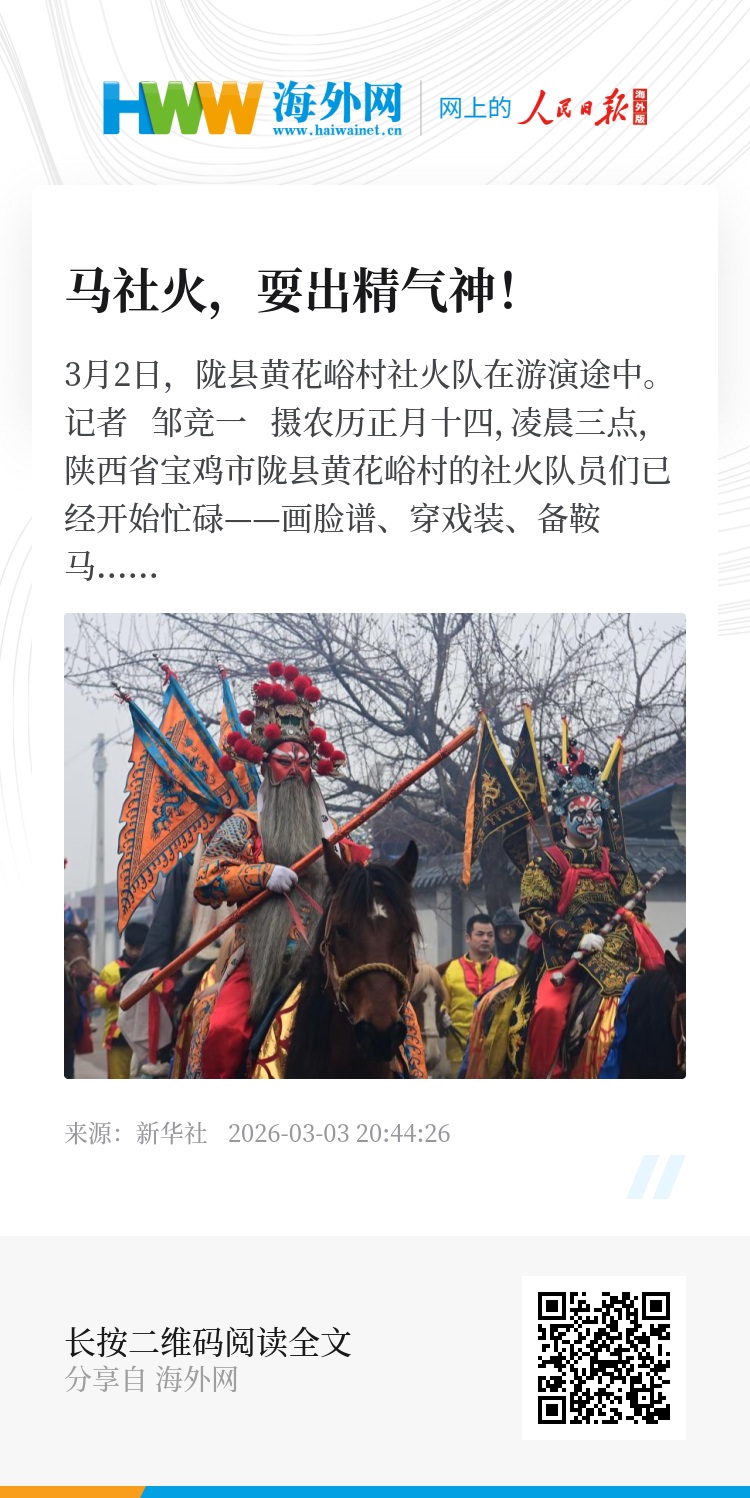 农历正月十四,凌晨三点,陕西省宝鸡市陇县黄花峪村的社火队员们已经开始忙碌——画脸谱、穿戏装、备鞍马……大家整装待发,准备共赴一场“马背上的盛会”。