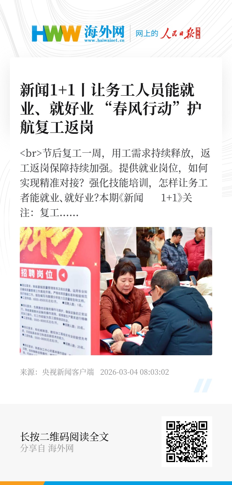 节后复工一周,用工需求持续释放,返工返岗保障持续加强。提供就业岗位,如何实现精准对接?强化技能培训,怎样让务工者能就业、就好业?本期《新闻 1+1》关注:复工返岗,“春风行动”如何护航?