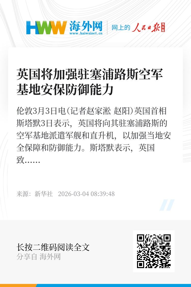 新华社伦敦3月3日电(记者赵家淞 赵阳)英国首相斯塔默3日表示,英国将向其驻塞浦路斯的空军基地派遣军舰和直升机,以加强当地安全保障和防御能力。