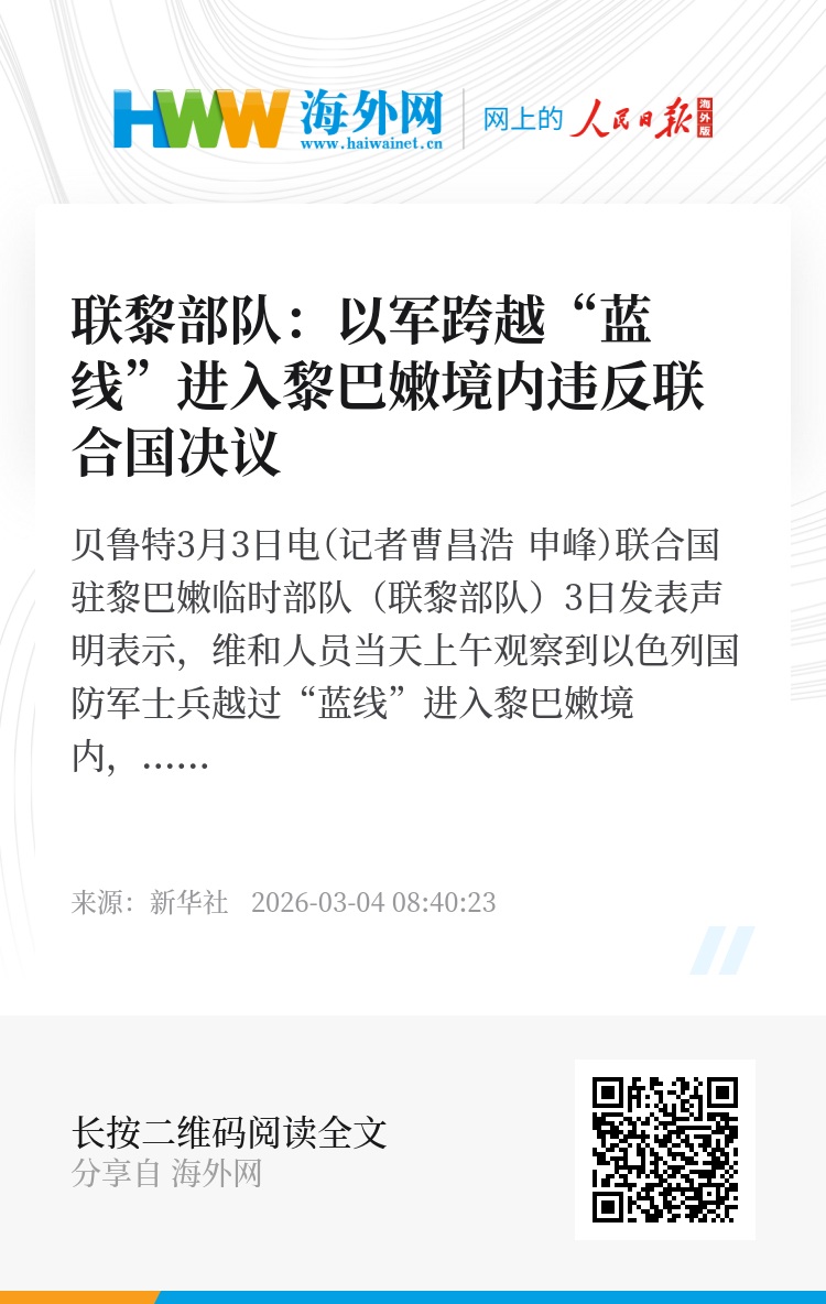 新华社贝鲁特3月3日电(记者曹昌浩 申峰)联合国驻黎巴嫩临时部队(联黎部队)3日发表声明表示,维和人员当天上午观察到以色列国防军士兵越过“蓝线”进入黎巴嫩境内,随后返回“蓝线”以南地区。