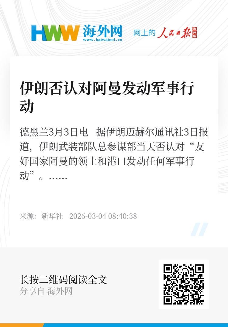 新华社德黑兰3月3日电 据伊朗迈赫尔通讯社3日报道,伊朗武装部队总参谋部当天否认对“友好国家阿曼的领土和港口发动任何军事行动”。