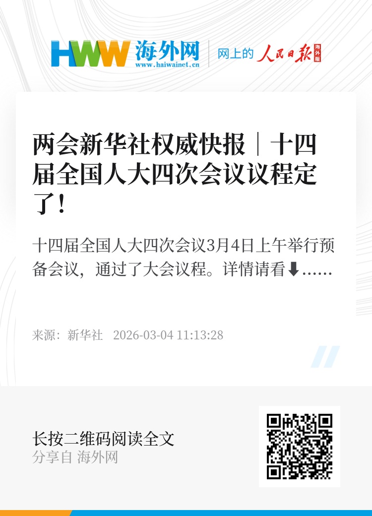 十四届全国人大四次会议3月4日上午举行预备会议,通过了大会议程。详情请看⬇