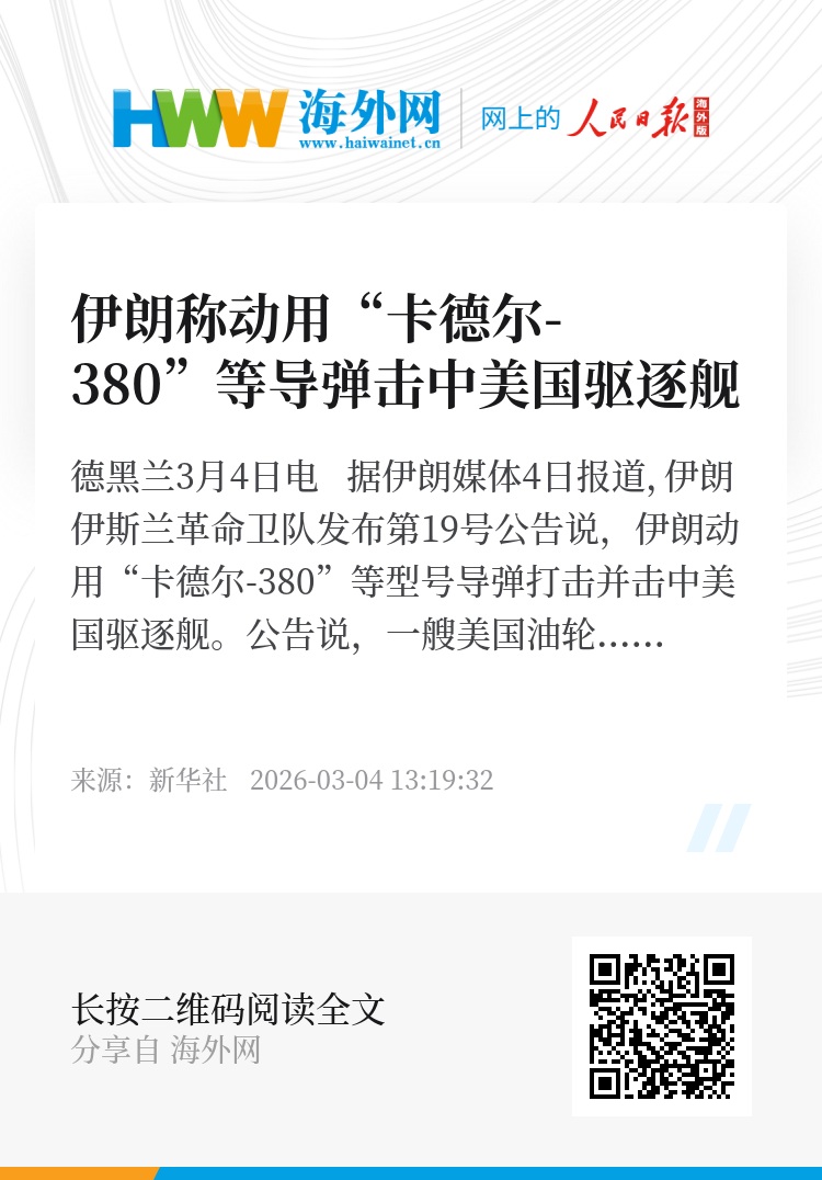 新华社德黑兰3月4日电 据伊朗媒体4日报道,伊朗伊斯兰革命卫队发布第19号公告说,伊朗动用“卡德尔-380”等型号导弹打击并击中美国驱逐舰。