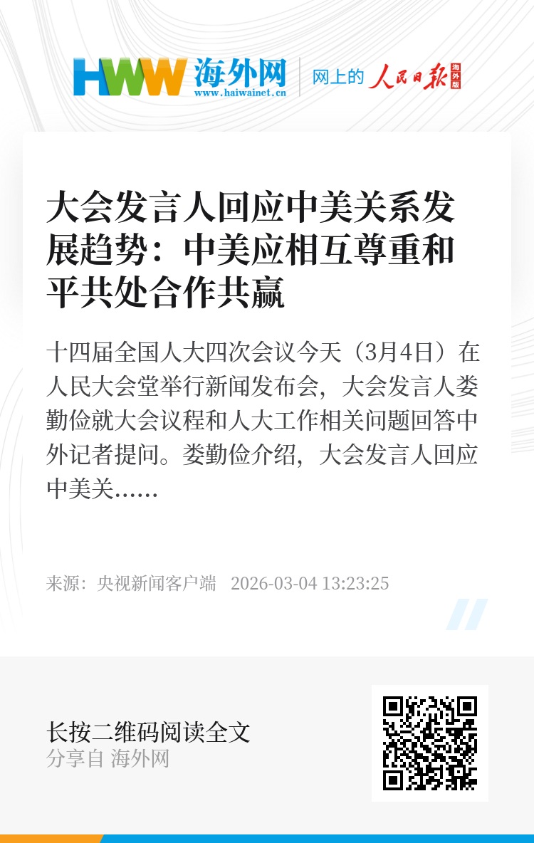 娄勤俭介绍,大会发言人回应中美关系发展趋势,中美应相互尊重,和平共处,合作共赢。