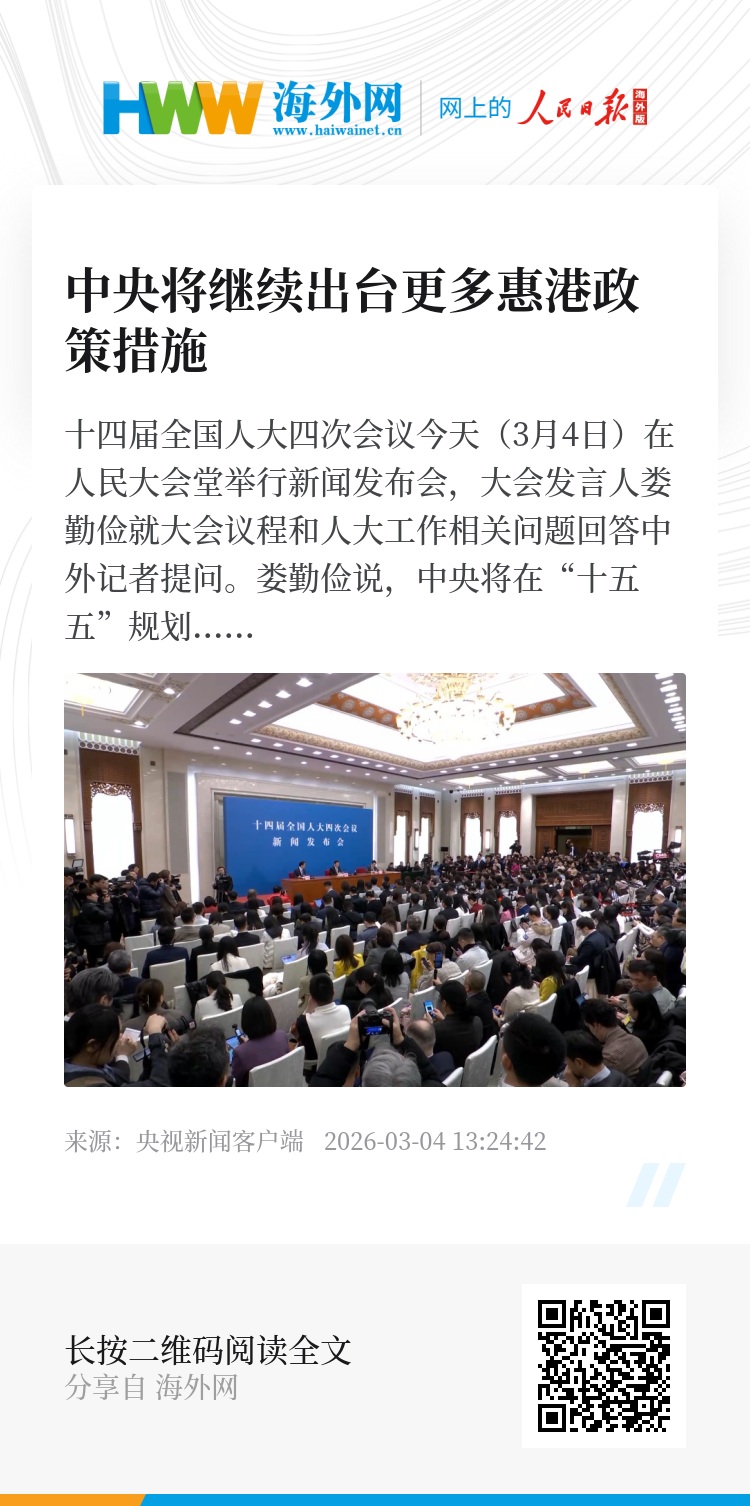 娄勤俭说,中央将在“十五五”规划中对支持香港发挥独特优势和重要作用进一步作出部署,并将继续出台更多惠港政策措施。