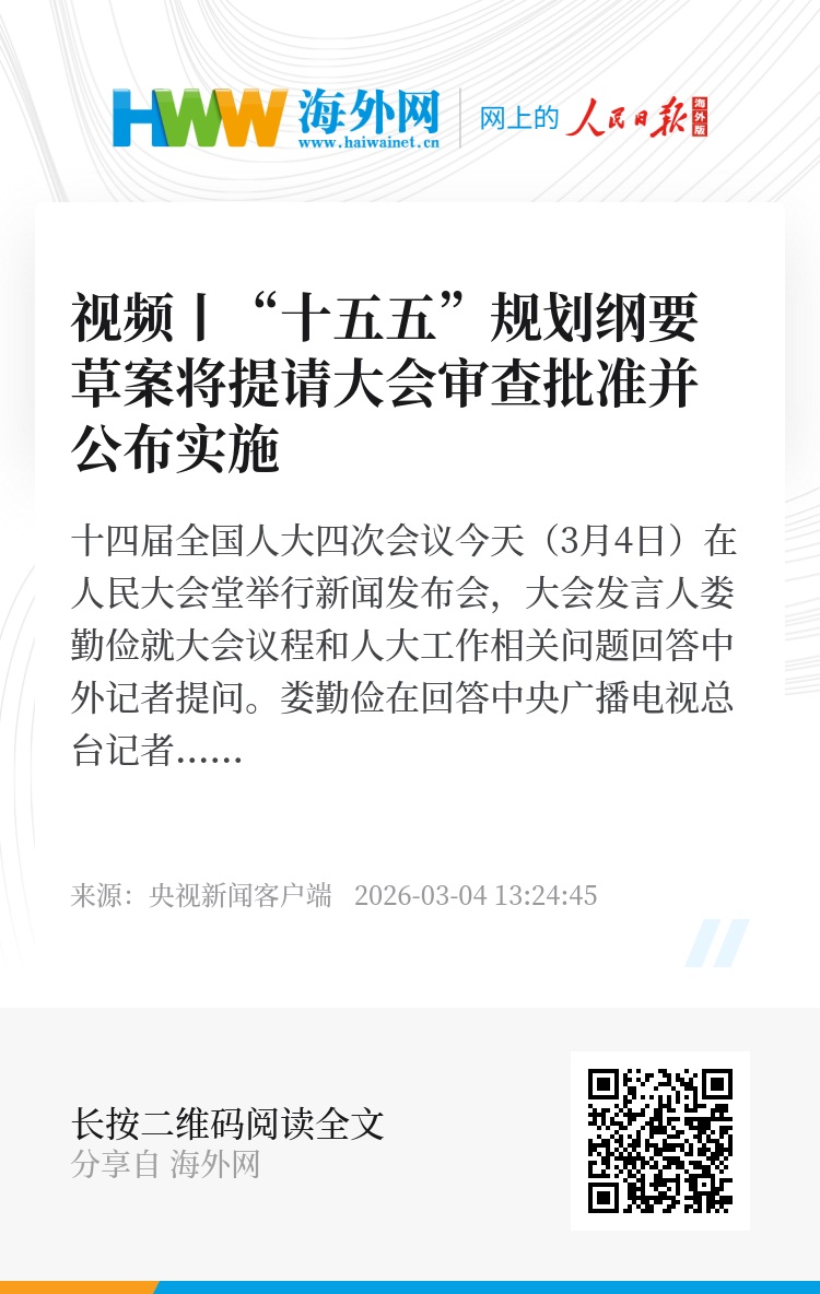 娄勤俭在回答中央广播电视总台记者相关提问时表示,“十五五”规划纲要草案在广泛征求意见的基础上,将提请此次大会审查批准并公布实施,使党的主张通过法定程序转化为国家意志和人民共同行动。此次大会将审议国家发展规划法草案,以法律形式将成熟做法固定下来,更好发挥国家发展规划的战略导向作用。