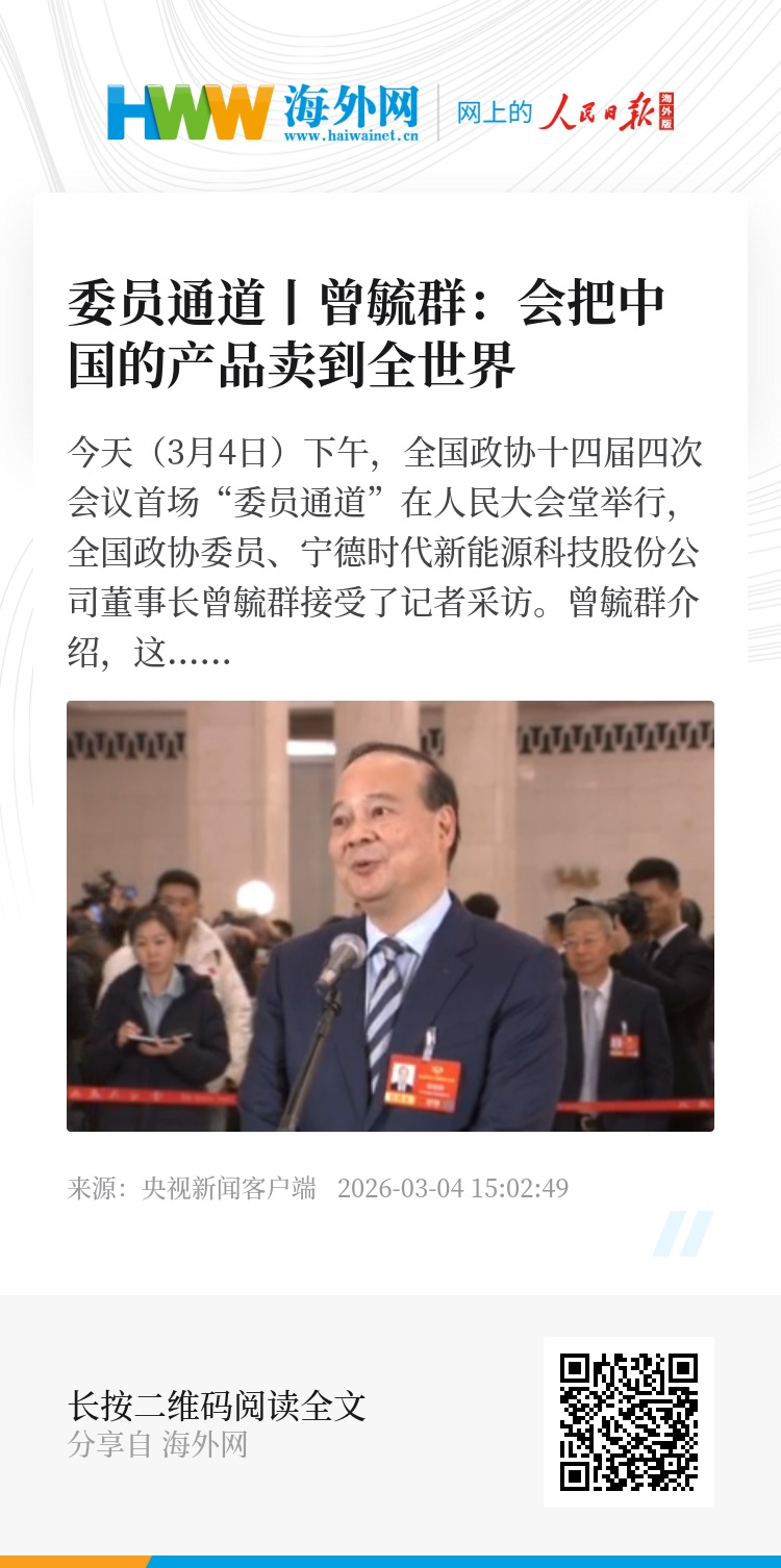 今天(3月4日)下午,全国政协十四届四次会议首场“委员通道”在人民大会堂举行,全国政协委员、宁德时代新能源科技股份公司董事长曾毓群接受了记者采访。