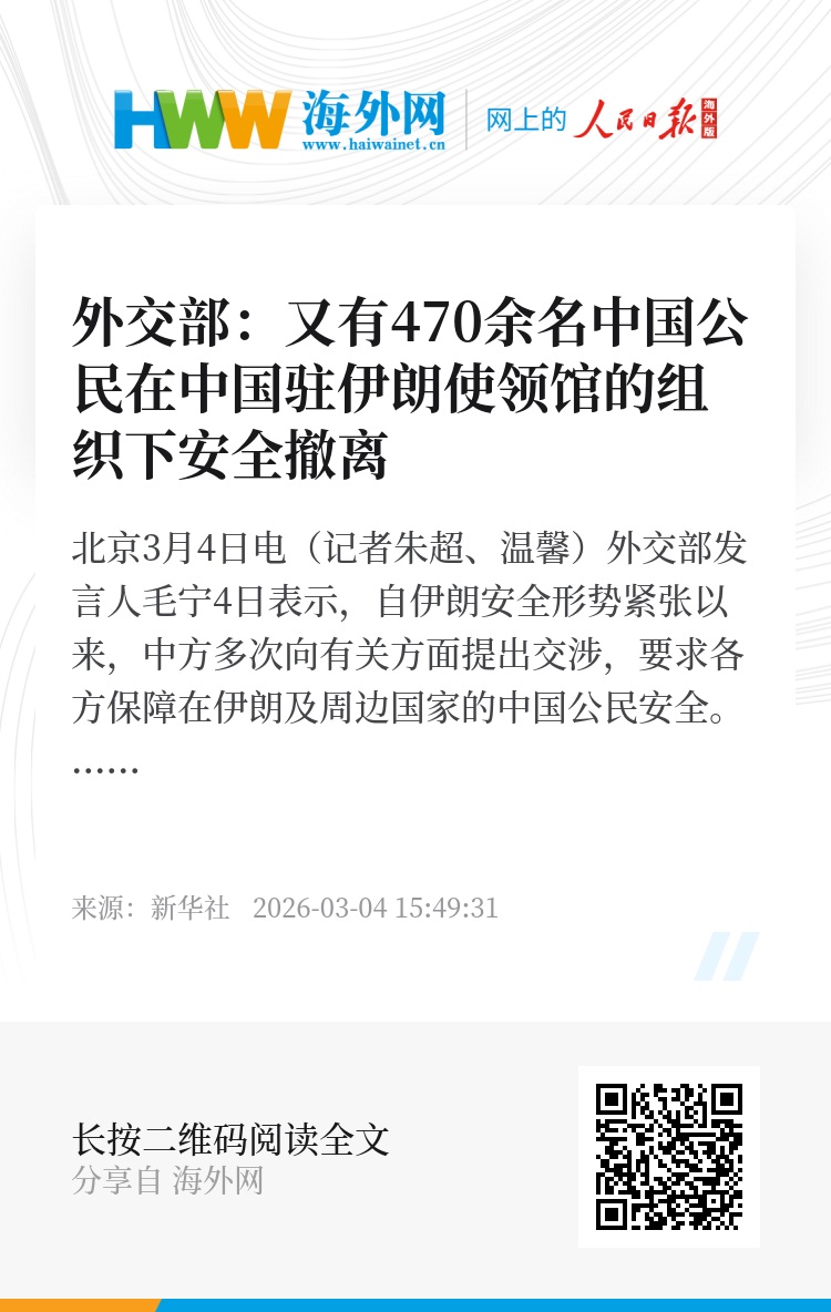 新华社北京3月4日电(记者朱超、温馨)外交部发言人毛宁4日表示,自伊朗安全形势紧张以来,中方多次向有关方面提出交涉,要求各方保障在伊朗及周边国家的中国公民安全。中国驻伊朗及周边国家使领馆昼夜坚守,协助多批中国公民撤离。战事爆发后,又有470余名中国公民在中国驻伊朗使领馆的组织下安全撤离。考虑到伊朗当前严峻的安全形势,我们再次郑重提醒在伊朗的中国公民加强自身防范,尽快安全撤离,及时向驻伊朗使领馆报备信息。