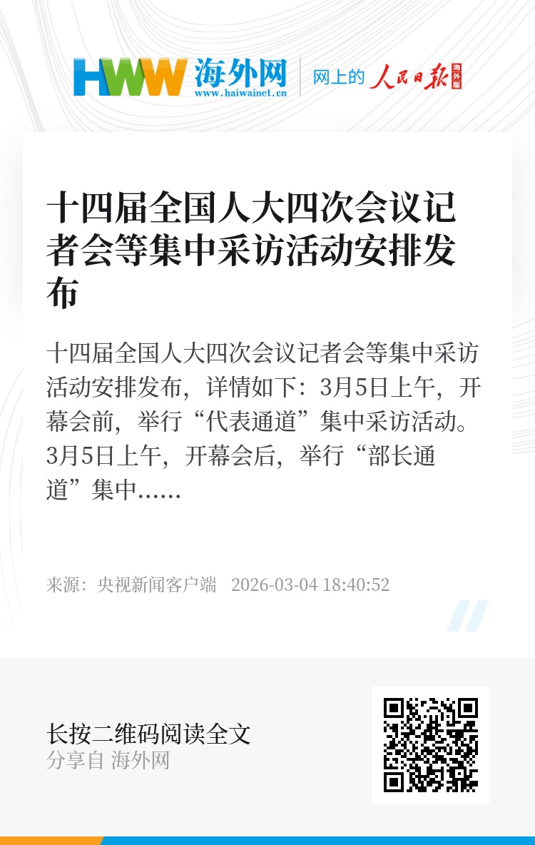 十四届全国人大四次会议记者会等集中采访活动安排发布,详情如下: