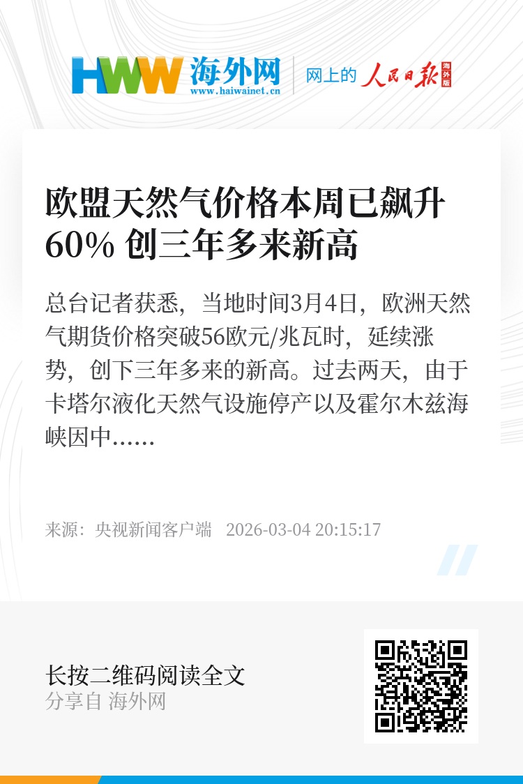 总台记者获悉,当地时间3月4日,欧洲天然气期货价格突破56欧元/兆瓦时,延续涨势,创下三年多来的新高。过去两天,由于卡塔尔液化天然气设施停产以及霍尔木兹海峡因中东局势紧张而关闭,天然气价格已飙升60%。