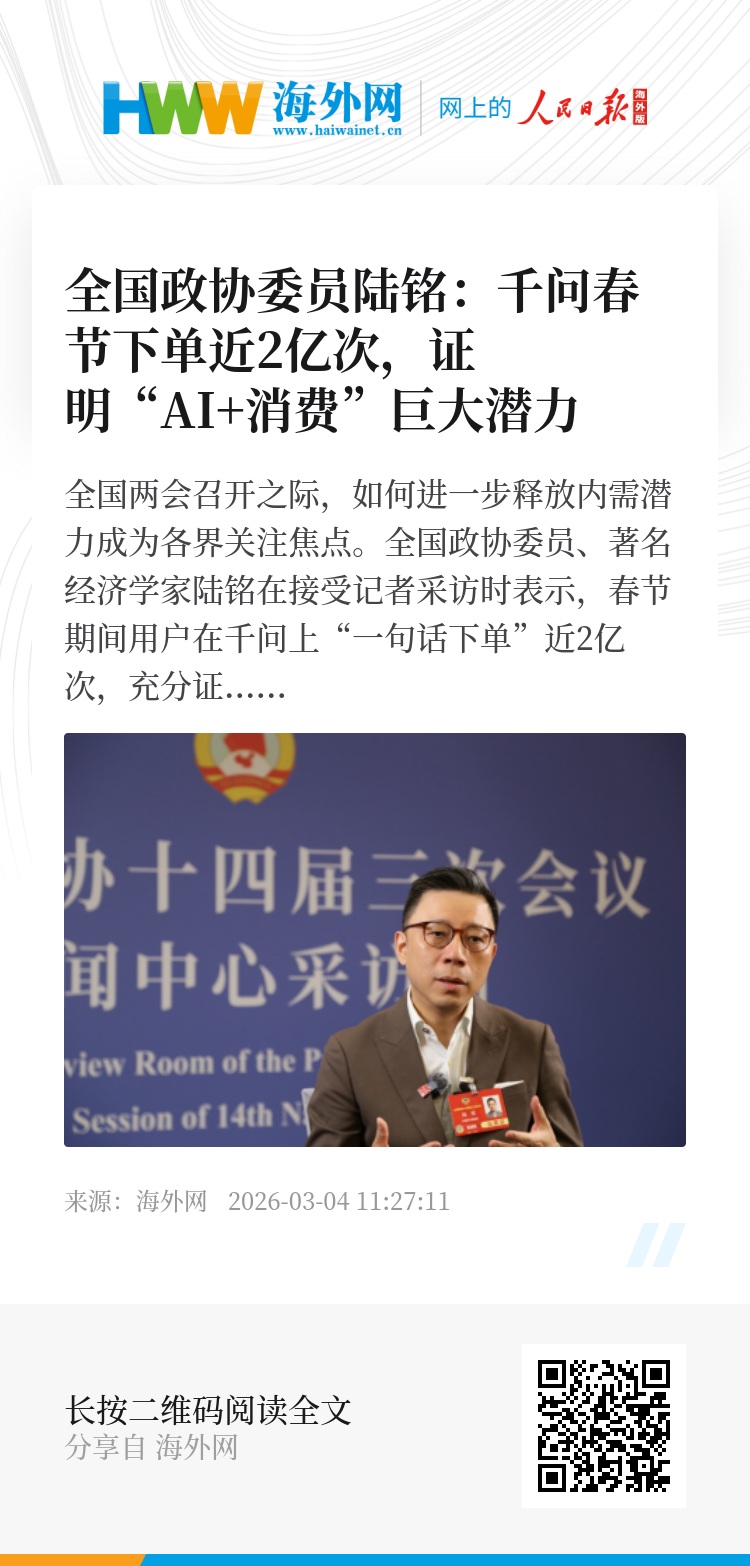 全国政协委员、著名经济学家陆铭在接受记者采访时表示,春节期间用户在千问上“一句话下单”近2亿次,充分证明“AI+消费”的巨大潜力。