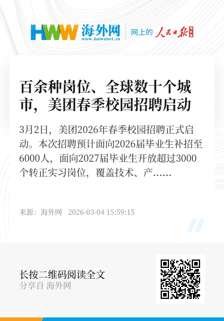 3月2日,美团2026年春季校园招聘正式启动。本次招聘预计面向2026届毕业生补招至6000人,面向2027届毕业生开放超过3000个转正实习岗位,覆盖技术、产品、商业分析、运营、金融、零售、职能、市场营销、设计、销售、客服和支持等10大类、100余种岗位,涉及北京、上海、深圳、成都、广州、香港、迪拜等全球几十个城市。据悉,网申投递将持续至5月底。