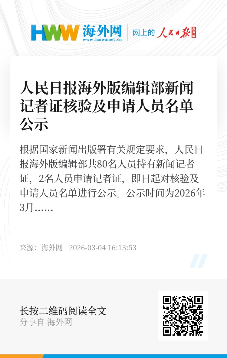 根据国家新闻出版署有关规定要求,人民日报海外版编辑部共80名人员持有新闻记者证,2名人员申请记者证,即日起对核验及申请人员名单进行公示。公示时间为2026年3月4日至3月13日。