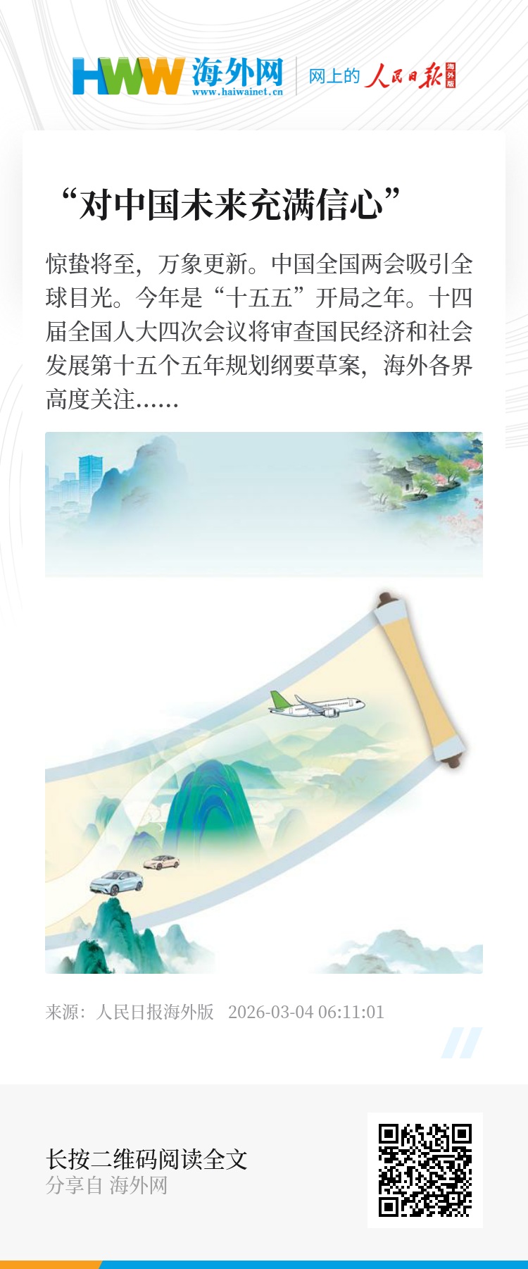 今年是“十五五”开局之年。十四届全国人大四次会议将审查国民经济和社会发展第十五个五年规划纲要草案,海外各界高度关注。回望“十四五”,中国经济破浪前行,彰显发展韧性与澎湃动能;展望“十五五”,国际社会对中国未来满怀期待。多位外国专家和华侨华人在接受本报记者采访时表示,期待中国继续以稳健、可持续的增长为世界带来更强信心、更多活力。