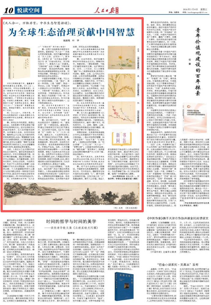 答:对于当今全球生态文明建设,中国哲学尤其是儒家哲学,能带来公允、可行的启示。儒家哲学主张天地的生机生意是“仁”,赋予自然以崇高的价值;主张天地之间“人”是最宝贵的,赋予人以价值;指出人的宝贵就在于体会到人心的生机和自然生机是一致的,通过扩展内心的仁达到万物并育、与天地万物为一体的状态。这种生态智慧可以成为世界性的文化价值。与此同时,儒家哲学主张“万物并育而不相害,道并行而不相悖”,这为全球生态治理奠定了文明交流互鉴的理论基础。由此可见,包括儒家哲学在内的中华优秀传统文化,为世界奉献了独一无二的生态智慧,值得广为传播和深入阐释。(张鹏禹 叶 子)