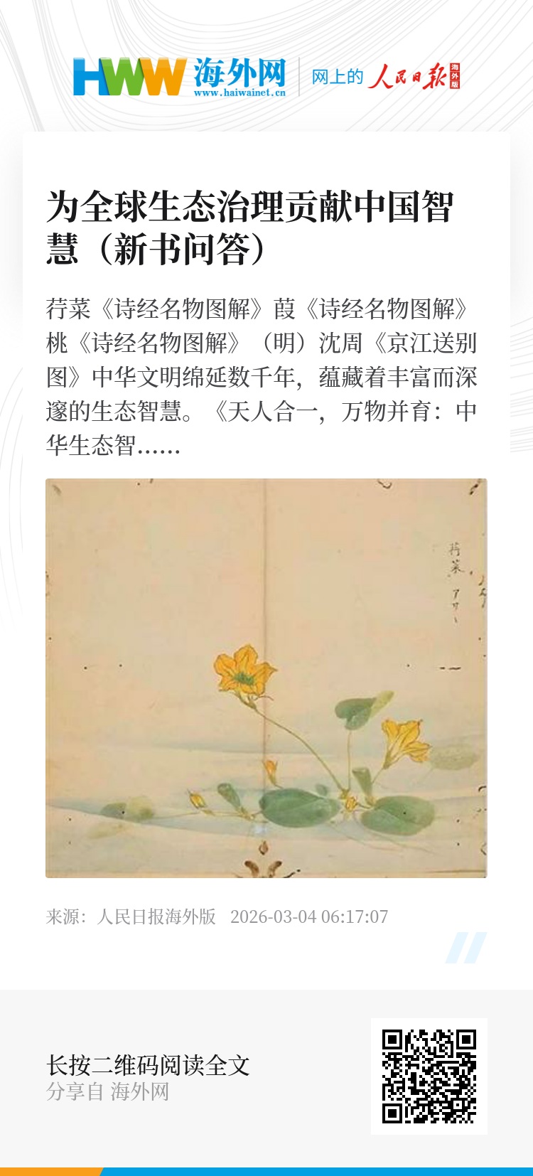 问:面对气候变化、生物多样性危机等全球性问题,你认为中华生态智慧中的“仁及草木”等思想,能为全球生态治理与合作提供怎样的启发?