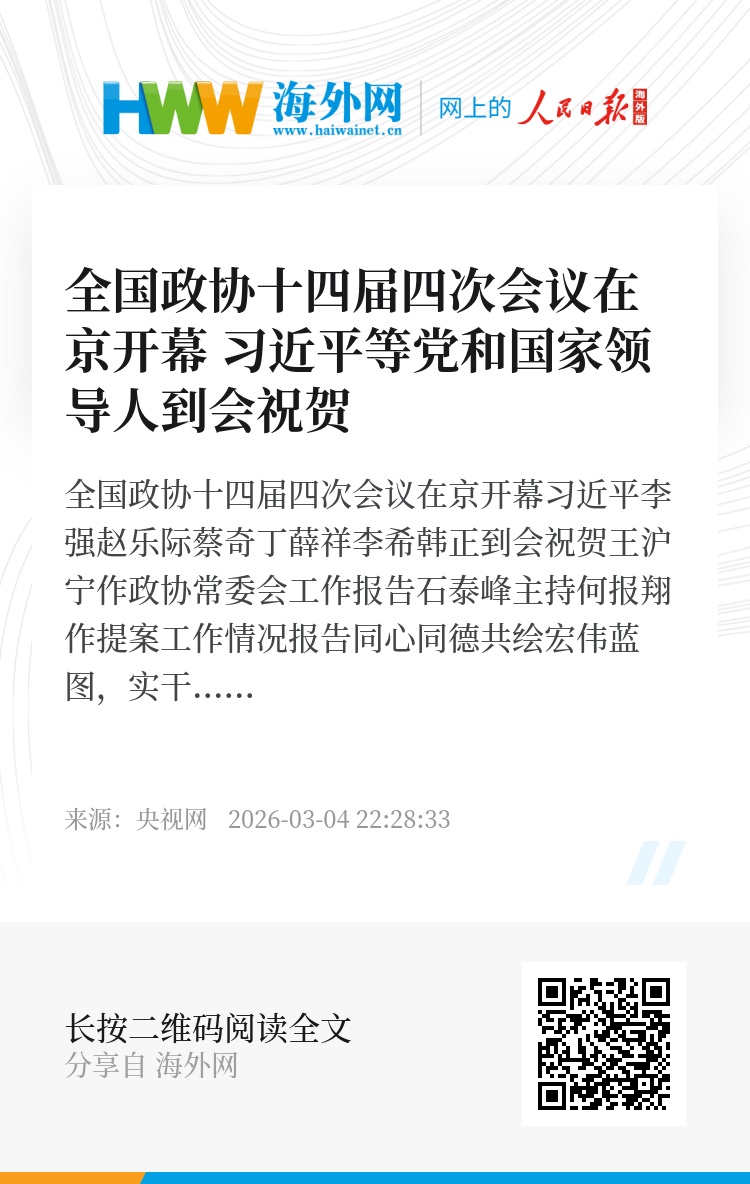 同心同德共绘宏伟蓝图,实干奋斗共创时代伟业。中国人民政治协商会议第十四届全国委员会第四次会议4日下午在人民大会堂开幕。2000多名全国政协委员将围绕中共中央决策部署,聚焦“十五五”规划纲要制定和实施,深入协商议政、积极建言献策,为“十五五”开好局、起好步广泛凝心聚力,为以中国式现代化全面推进强国建设、民族复兴伟业贡献智慧和力量。